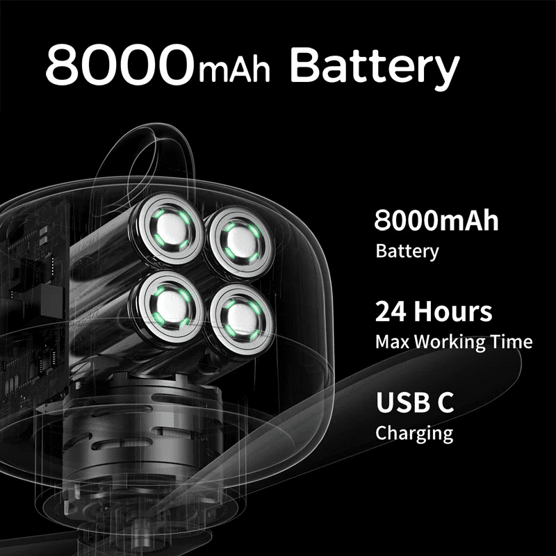 Jisulife FA16 được trang bị viên pin 8000mAh, mang lại thời gian sử dụng liên tục từ 8,5 đến 25 giờ tùy chế độ gió. Điều này giúp người dùng hoàn toàn yên tâm khi sử dụng trong những chuyến đi dài ngày, nơi khó có nguồn điện sạc. Chỉ với một lần sạc đầy trong khoảng 6–7 giờ qua cổng Type-C, bạn đã có thể thoải mái tận hưởng làn gió mát mẻ suốt cả ngày và đêm. Đây là tính năng đặc biệt hữu ích cho các buổi cắm trại, picnic hoặc khi xảy ra mất điện bất ngờ.